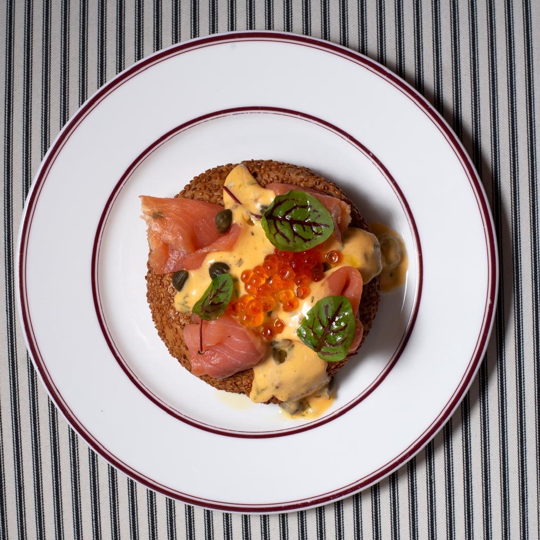 crisp simit with poached egg,smoked salmon roe and bearnaise sause